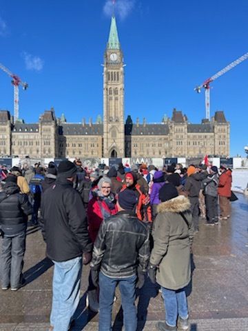 Truckers singing hymns in front of the Canadian Parliament Building