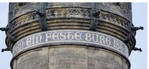 There is more to the unusual “Martin Luther connection.” The song “A Mighty Fortress is Our God”, which Mr. Jonker and his truck-driving friends were singing when I phoned him, is based on Psalm 46. When Martin Luther nailed the Ninety-Five Theses on the door (a common practice at that location, as it was a type of bulletin board) of the church in Wittenberg, Germany on October 31st, 1517, touching off the Protestant (from the word “protest”) Reformation, it was at the base of a large Gothic tower with a rounded dome and spires pointing towards heaven, on which the words are engraved at the top, “Ein Feste Burg ist Unser Gott, Ein Gute Wehr und Waffen.” (See two pictures of the tower) Those are the opening words of the famous Martin Luther hymn, “A mighty fortress is our God, a bulwark never failing.”