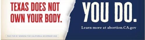 Newsom is now placing signs in Red States – that is, pro-life states – across America, inviting people to come to California to kill their offspring.
