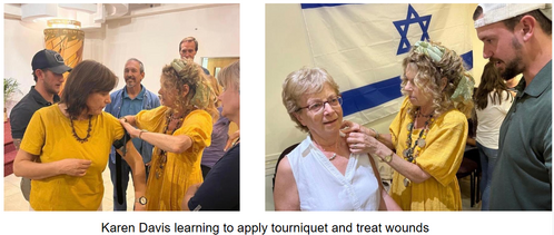 Secondly, we have additional information from the Carmel Congregation. Carmel Congregation co-founder Karen Davis wrote this to us today: “Last night, I participated in a ‘war scenario’ first-aid class taught by veteran U.S. army medics who came to support Israel at this time. Practicing packing an artery wound to stop a bleed… Learning to use a tourniquet to stop a bleed… Hard to believe this is the reality we are facing now…”