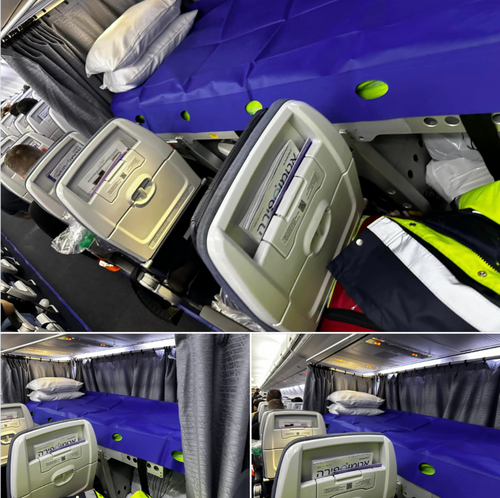 Have never seen this. We have boarded in Athens Greece, but we are waiting for a passenger who is coming by ambulance to the plane. He is Israeli, injured in Greece, and they are bringing him back home to Israel. They have converted the back rows to a bed for him. Amazing. Israel leaves no one behind!