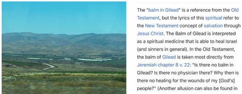 Looking east across the Jordon River at Jordon… at the Mountains of Gilead. Does anyone remember the old song, “There is a balm… in Gilead”? The balm refers to a healing substance like frankincense. In the song, it refers to Jesus or the Holy Spirit as a healer.