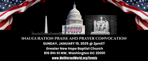Eight years ago, 24 hours before Donald Trump was sworn in as President of the United States, Well Versed hosted a special prayer time. We are doing it again, hosting the Inauguration Praise and Prayer Convocation, this time the day before the Inauguration on Sunday, January 19th from 2:00pm to 4:00pm at the Greater New Hope Baptist Church, a few blocks from the U.S. Capitol. I asked Tony Perkins and the Family Research Council to partner with us this time.