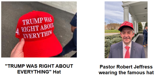 - On a humorous note, on the edge of his desk were two hats. I thought they were the standard MAGA hats. However, I did not see what they said across the front. Stitched in wide white letters were the words, “TRUMP WAS RIGHT ABOUT EVERYTHING.” He quickly tossed the hats to two persons standing the closest to the Resolute Desk at that moment: Pastor Robert Jeffress and Gary Bauer. Those two great men were worthy of the hats – given to them by the President himself – in the Oval Office. What a keepsake!