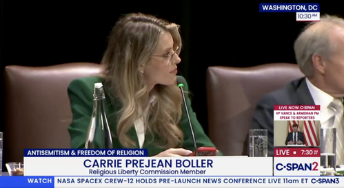 “Carrie Prejean Boller has been removed from President Trump’s Religious Liberty Commission. No member of the Commission has the right to hijack a hearing for their own personal and political agenda on any issue. This is clearly, without question, what happened Monday in our hearing on antisemitism in America. This was my decision.