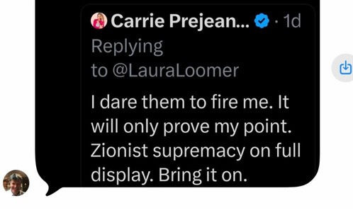 Apparently Carrie illogically believes that she is not antisemitic, while believing that the Jews do not have a right to exist, have a homeland, a right to gather in that homeland, and have no right to defend themselves.